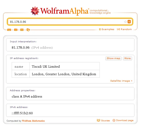 Wolfram internally uses the IP2Location databases of FraudLabs and MaxMind, Inc to compute the geographic information such as country, city, latitude, longitude, ISP and domain name associate with an IP address. The FAQ says that their IP-Country database is over 99% accurate though it may not work with every IP address that’s out there.